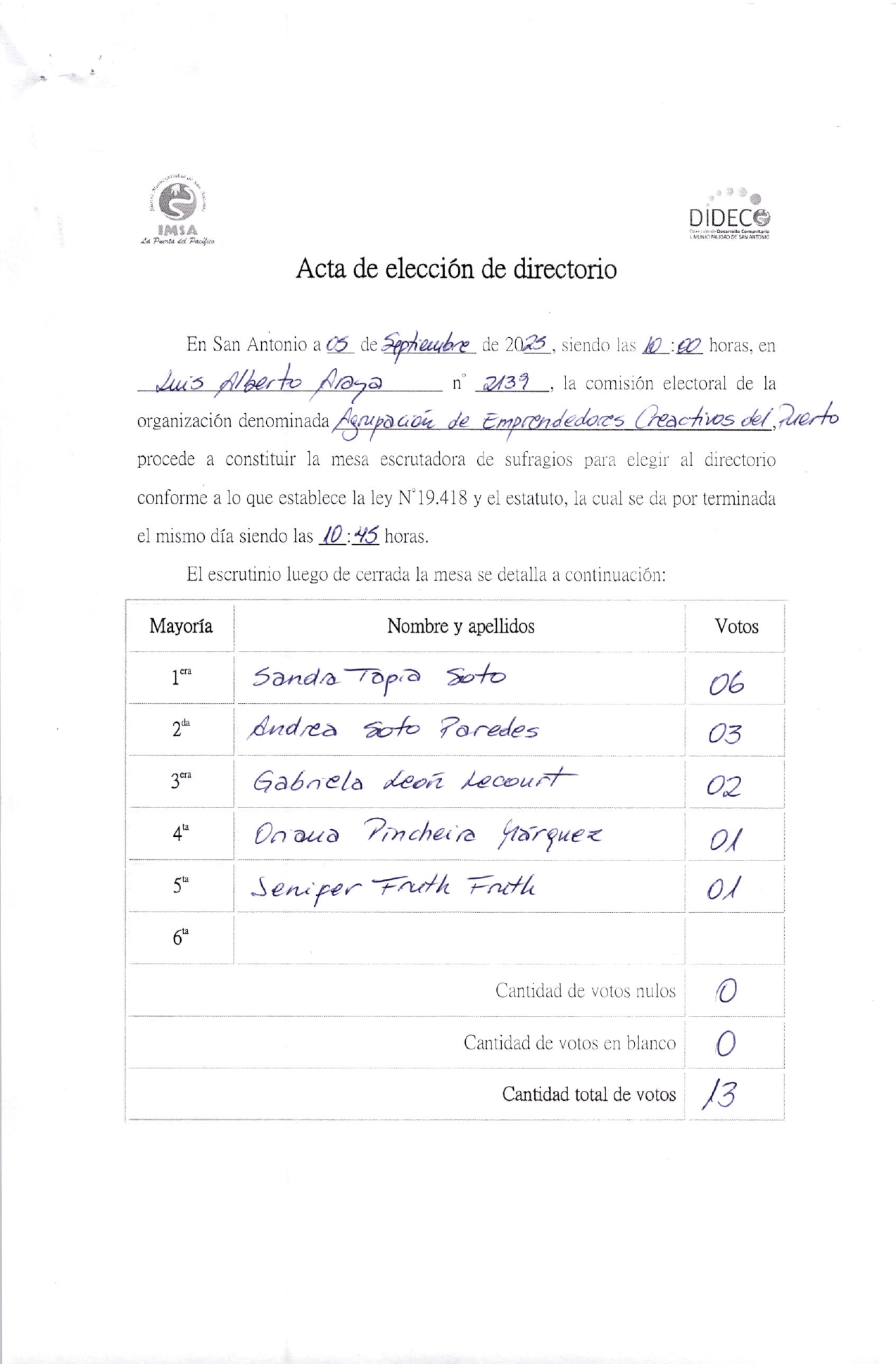 Acta de elecciones AGRUPACION EMPRENDEDORES CREATIVOS DEL PUERTO