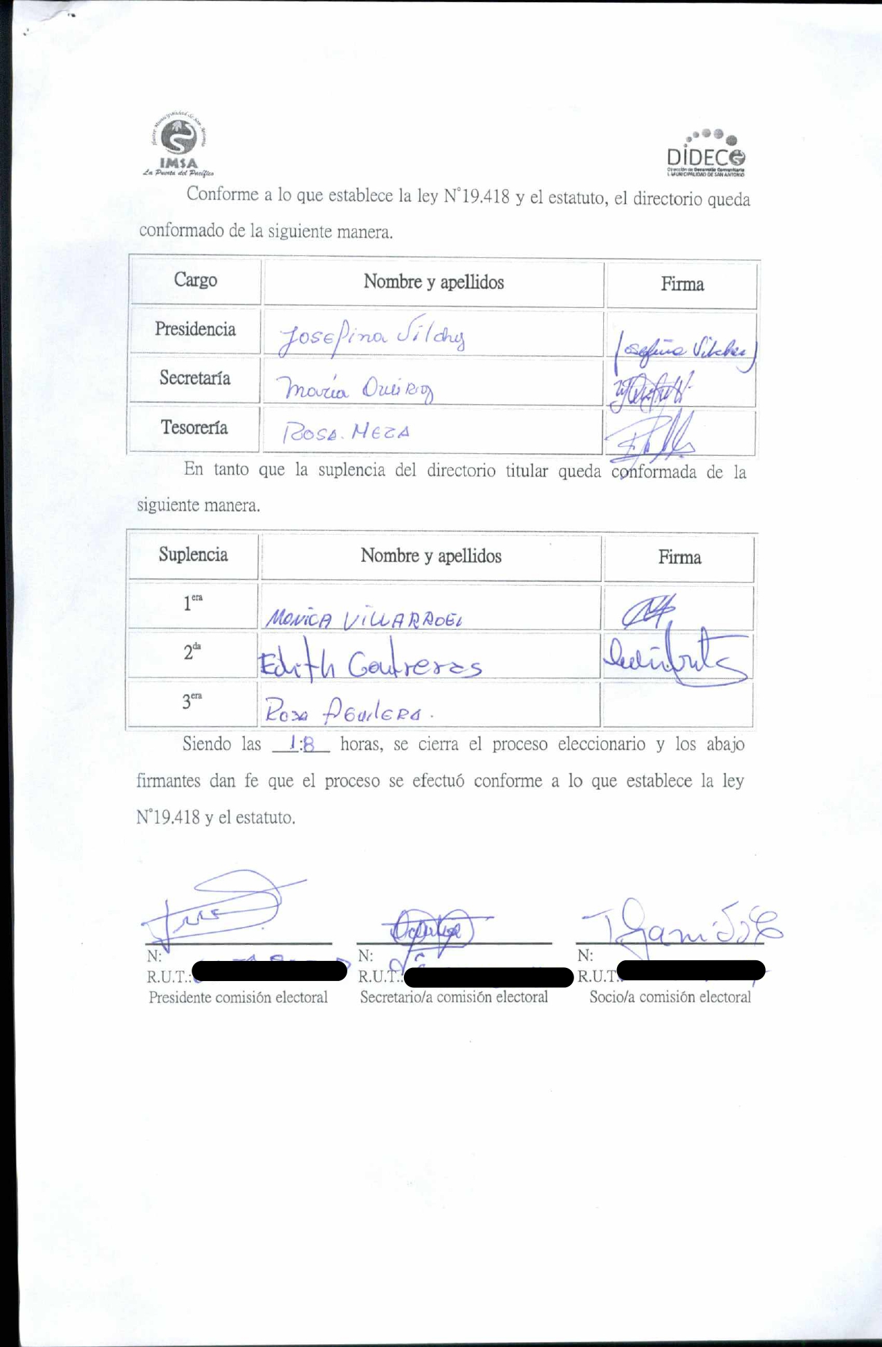 Acta de elecciones "Junta de Vecinos Los Aromos"