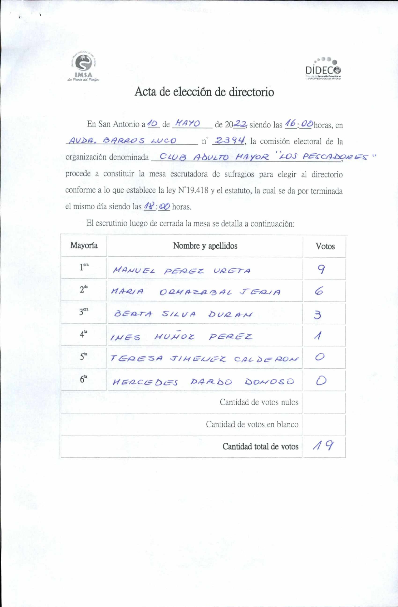 Acta de elección "Club Adulto Mayor Los Pescadores"
